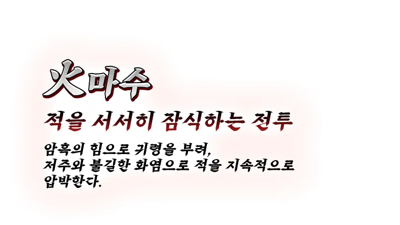 특히 4가지 무공계열이 존재하는데, 검수는 검기를 모아 검진을 펼치고 빠른 연속 공격으로 적을 베어내는 공격 속도 중심의 전투에 능하며, 마수는 암흑의 힘으로 귀령을 부려 저주와 불길한 화염으로 적을 지속적으로 압박하는 적을 서서히 잠식하는 전투에 능하다.